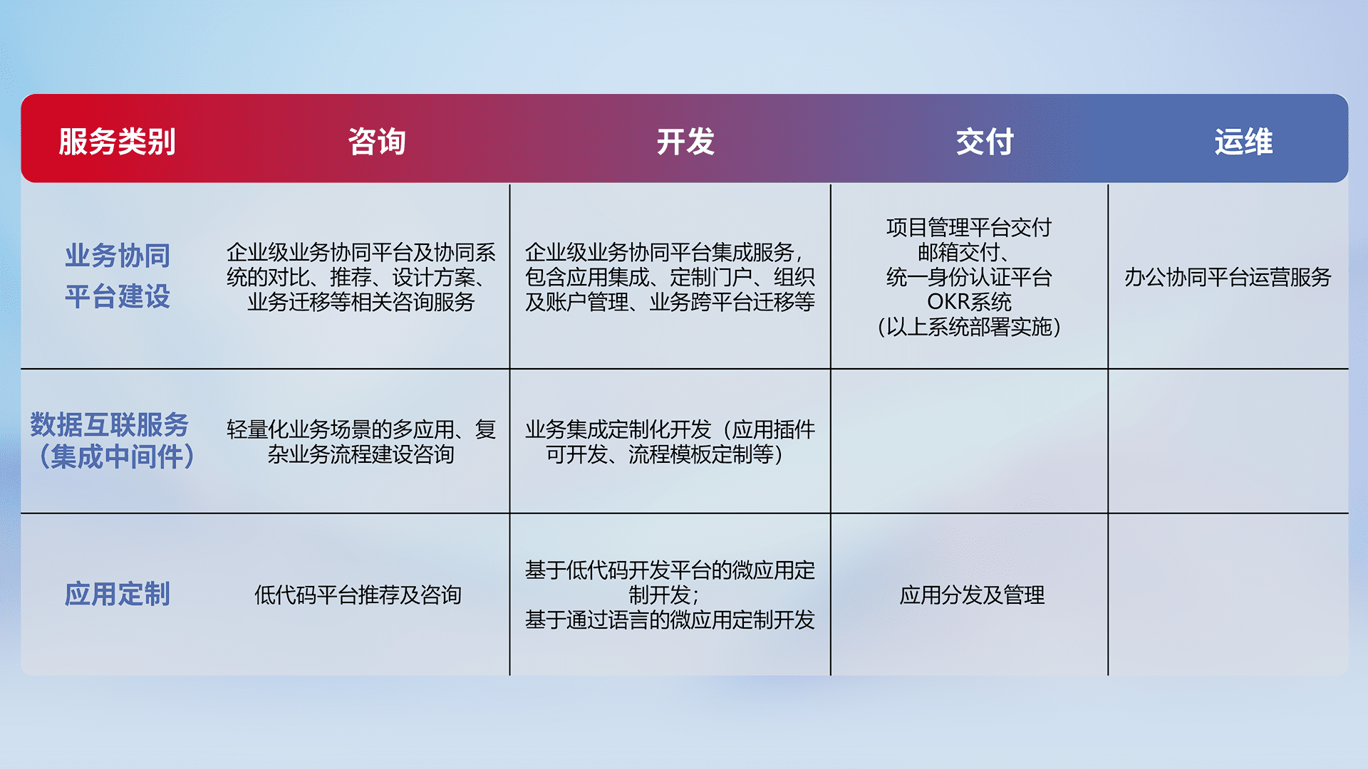 针对钉钉、、企微、、IDaas等平台级产品提供产品的规划、、、方案、、、、交付、、、定制化开发等服务,,,,实现如统一协同办公、、、、智能客户服务、、、、混合会议管理、、智能数据查询、、等业务场景,,,,实现数字化转型。。。。