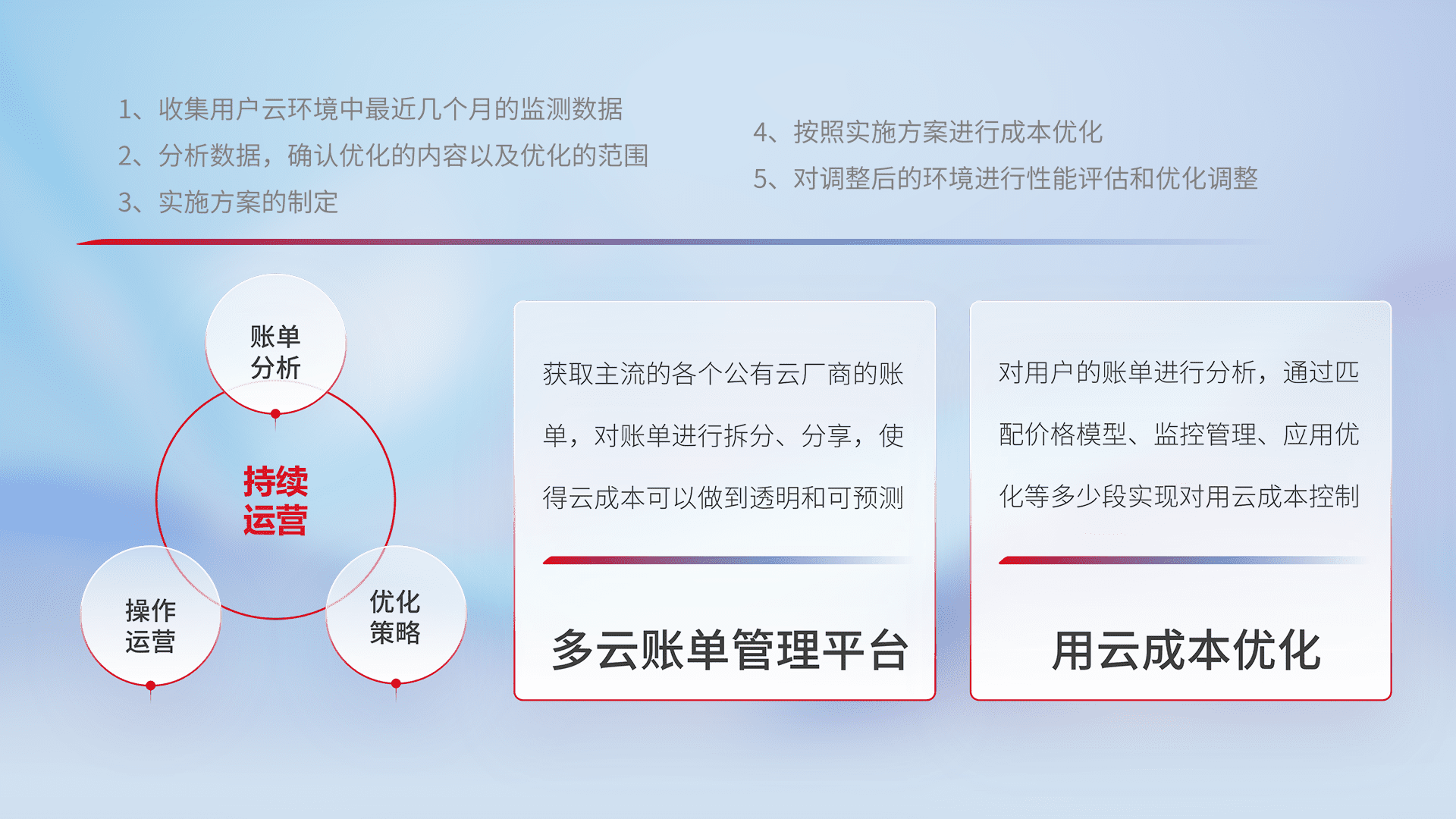 通过多云纳管,,,以统一的资源数据模型把客户的云资源进行抽象和封装,,,进而实现对多云资源的统一操作,,,,保障云资源管理的可靠性、、、、稳定性与可用性。。。。量身定制化运维内容,,,,配置、、开发运维、、、补丁管理、、、、备份、、监控、、、、认证和访问管理、、、审计和日常巡检等,,,保障在用云过程中的可靠度,,,,稳定度以及高可用率。。