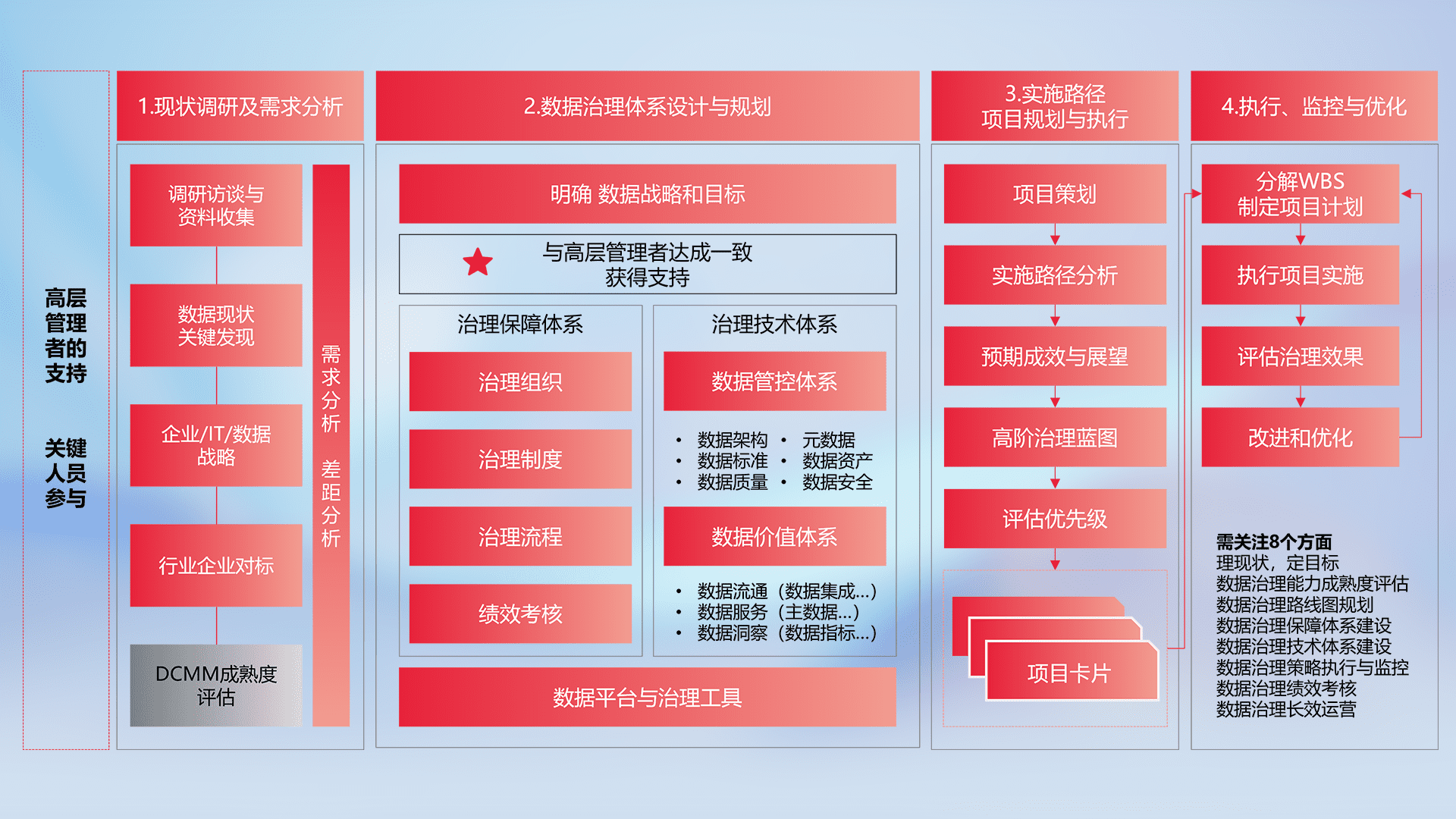 制定并执行统一的数据标准,,,规范数据定义和格式,,消除冗余和不一致性,,,,实现跨部门和跨系统的数据一致性,,,,为企业提供标准化的数据基础。。